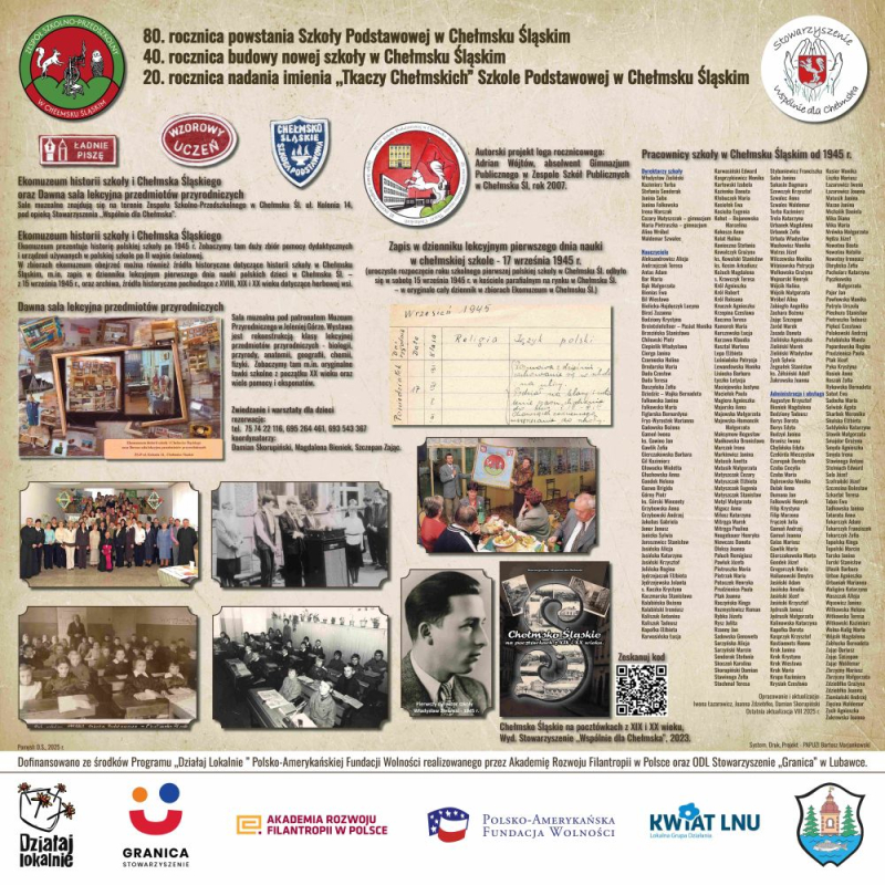 Zapraszamy do galerii zdjęć uroczystości rocznicowych w Zespole Szkolno-Przedszkolnym w Chełmsku Śląskim: 80. rocznica powstania polskiego szkolnictwa na Ziemiach Odzyskanych w tym Szkoły Podstawowej im. Tkaczy Chełmskich w Chełmsku Śląskim, 40. rocznica budowy nowej szkoły w Chełmsku Śląskim. oraz 20. lecie nadania imienia Tkaczy Chełmskich placówce oświatowej w Chełmsku Śląskim.