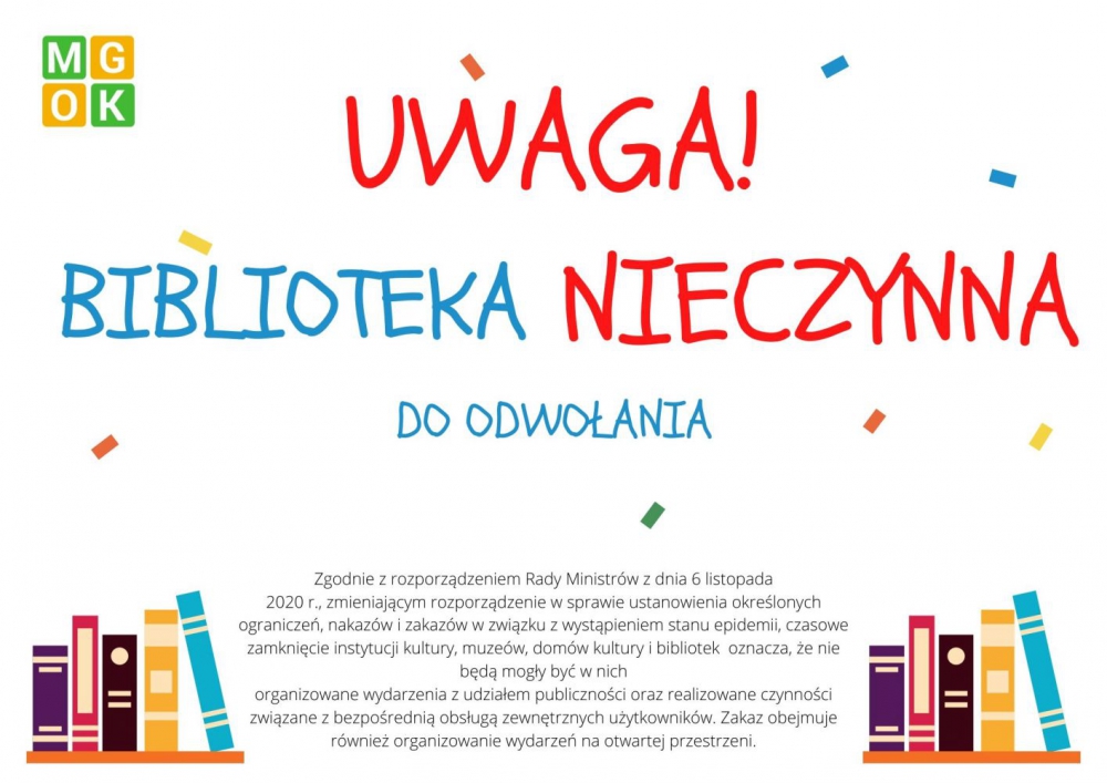 Zgodnie z rozporządzeniem Rady Ministrów z dnia 6 listopada 2020 r., zmieniającym rozporządzenie w sprawie ustanowienia określonych ograniczeń, nakazów i zakazów w związku z wystąpieniem stanu epidemii, czasowe zamknięcie instytucji kultury, muzeów, domów kultury i bibliotek oznacza, że nie będą mogły być w nich organizowane wydarzenia z udziałem publiczności oraz realizowane czynności związane z bezpośrednią obsługą zewnętrznych użytkowników. Zakaz obejmuje również organizowanie wydarzeń na otwartej przestrzeni.