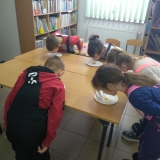 Na zakończenie świętowaliśmy z Kubusiem Puchatkiem. Dzieci słuchały opowieści o misiu, a potem odpowiadały na zadane zagadki o przyjaciołach Kubusia. Były zawody kto szybciej wyliże talerzyk z miodem oraz ułoży obrazek z puzzli o przygodach Kubusia Puchatka. Najbardziej przedszkolakom podobała się zabawa w przyklejanie ogona Kłapouchemu, która jak wiadomo często go gubił. Na pożegnanie naszych spotkań dzieci dostały książeczki i słodycze oraz obiecaliśmy się kiedyś spotkać. Do zobaczenia!!!