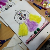 Podczas zajęć plastycznych wykorzystane zostały cekiny, pompony, wyciory, piórka... Zobaczcie jak ten miszmasz zmienił się w kolorowy obrazek- a w tym wypadku kolorową sowę!