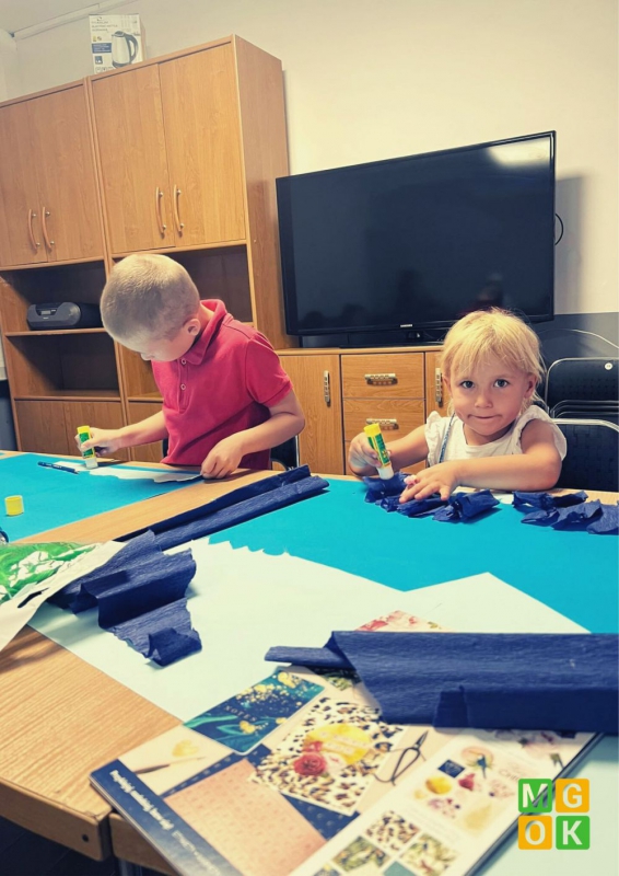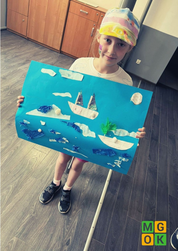 Dzieci podczas zajęć swoje wspomnienia przeniosły na duży arkusz papieru tworząc kolorową pocztówkę. Te kartki z wakacji na długo będą im przypominały beztroski letni czas!