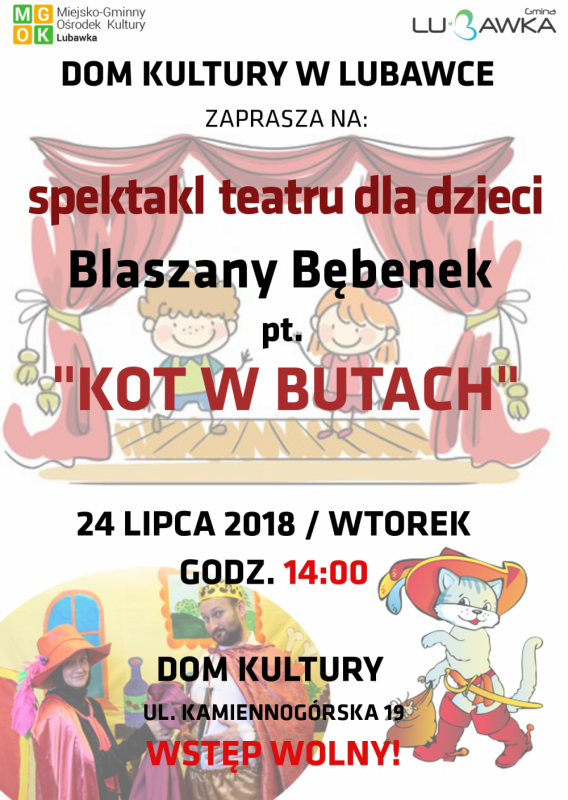 Dom Kultury w Lubawce serdecznie zaprasza na przedstawienie teatralne grupy Blaszany Bębenek pt. "Kot w butach", które odbędzie się 24 lipca br. (wtorek) o godz. 14:00 w sali widowiskowej Domu Kultury w Lubawce. Wstęp na wydarzenie jest bezpłatny.