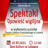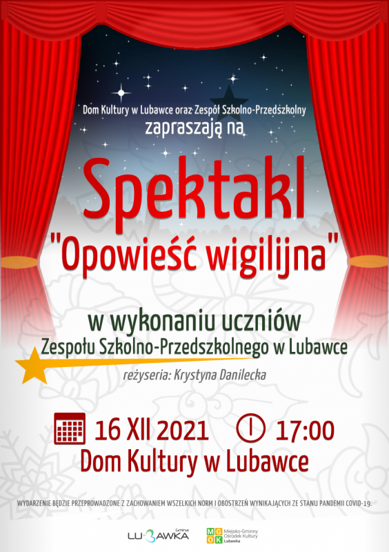 W czwartek, 16 grudnia 2021 r. w sali widowiskowej Domu Kultury w Lubawce odbędzie się świąteczny spektakl pt. "Opowieść Wigilijna". Uczniowie Zespołu Szkolno-Przedszkolnego w Lubawce przedstawią własną interpretację kultowej powieści Charlesa Dickensa.