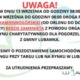 W dniu 13 września od godziny 08:00 do 14 września do godziny 08:00 droga przy ul. Kamiennogórskiej w Lubawce ( od Orlenu do Domu Kultury) będzie zamknięta z powodu organizacji Festynu Charytatywnego dla Pogorzelców z Gminy Lubawka