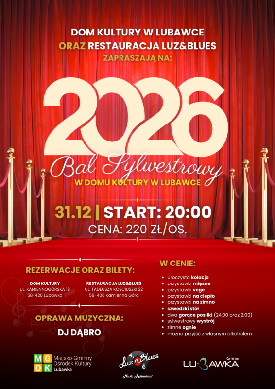 Dom Kultury w Lubawce wraz z Restauracją Luz & Blues serdecznie zapraszają mieszkańców na niezapomniany Bal Sylwestrowy, który odbędzie się 31 grudnia 2025 roku w sali Domu Kultury w Lubawce.