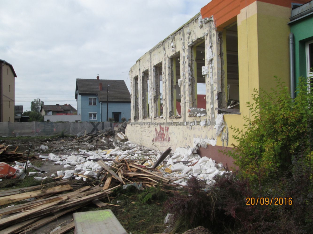 Wykonawca jest w trakcie rozbiórki dwóch sal gimnastycznych. Przed rozpoczęciem prac odzyskano nie które elementy m.in. okna czy grzejniki.