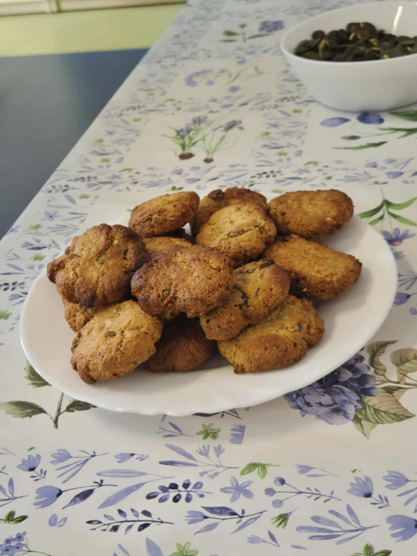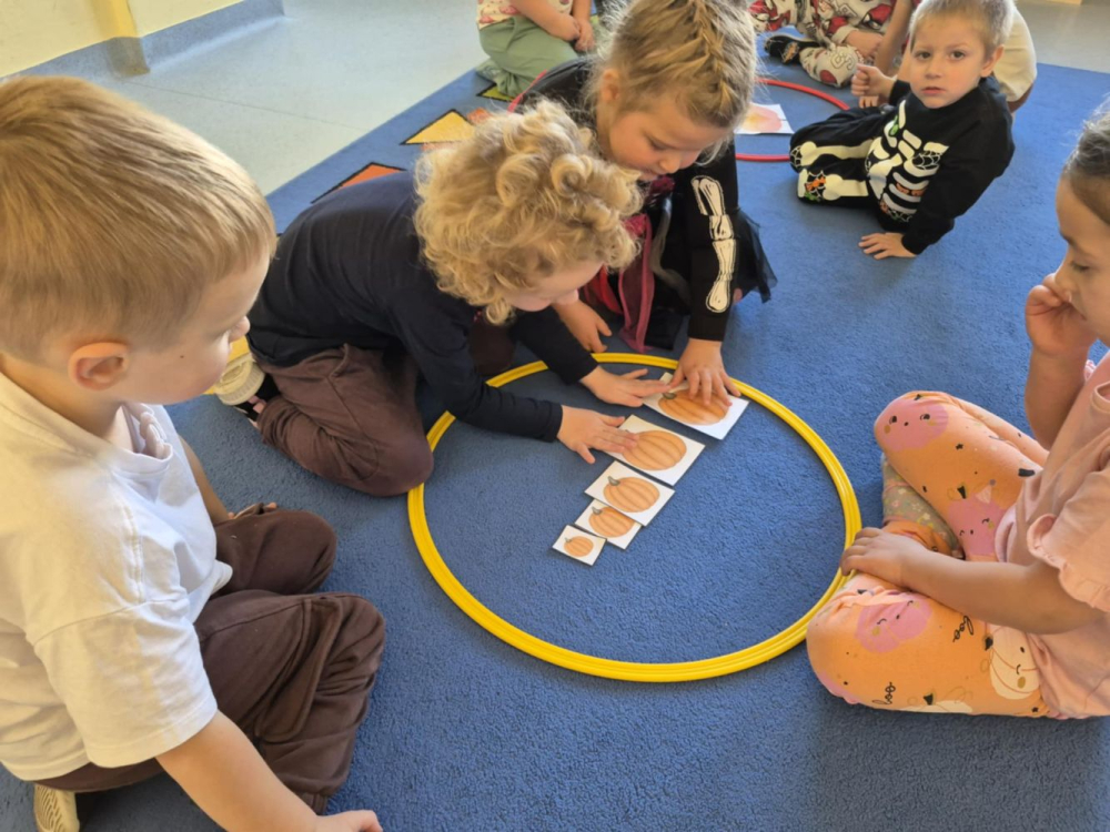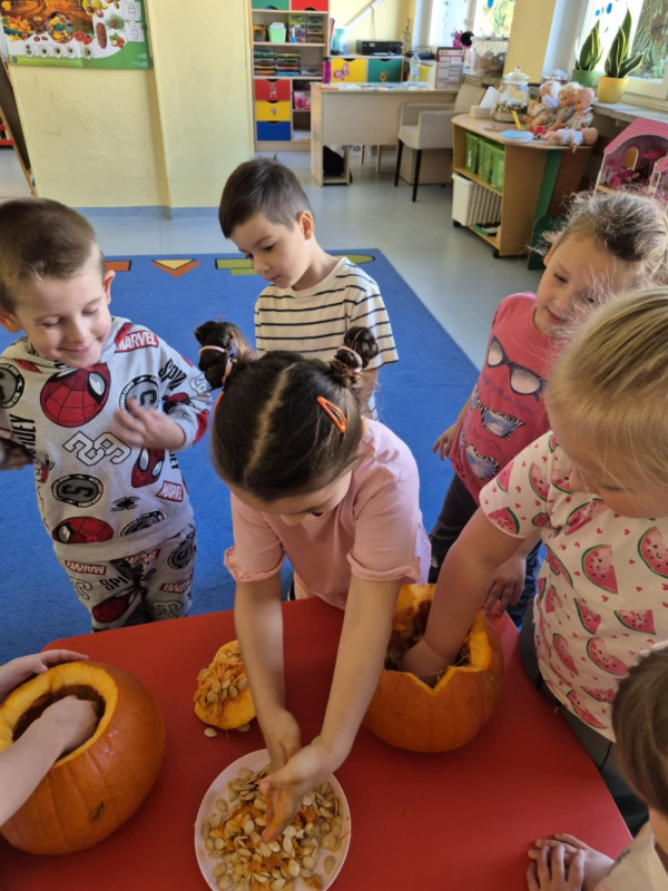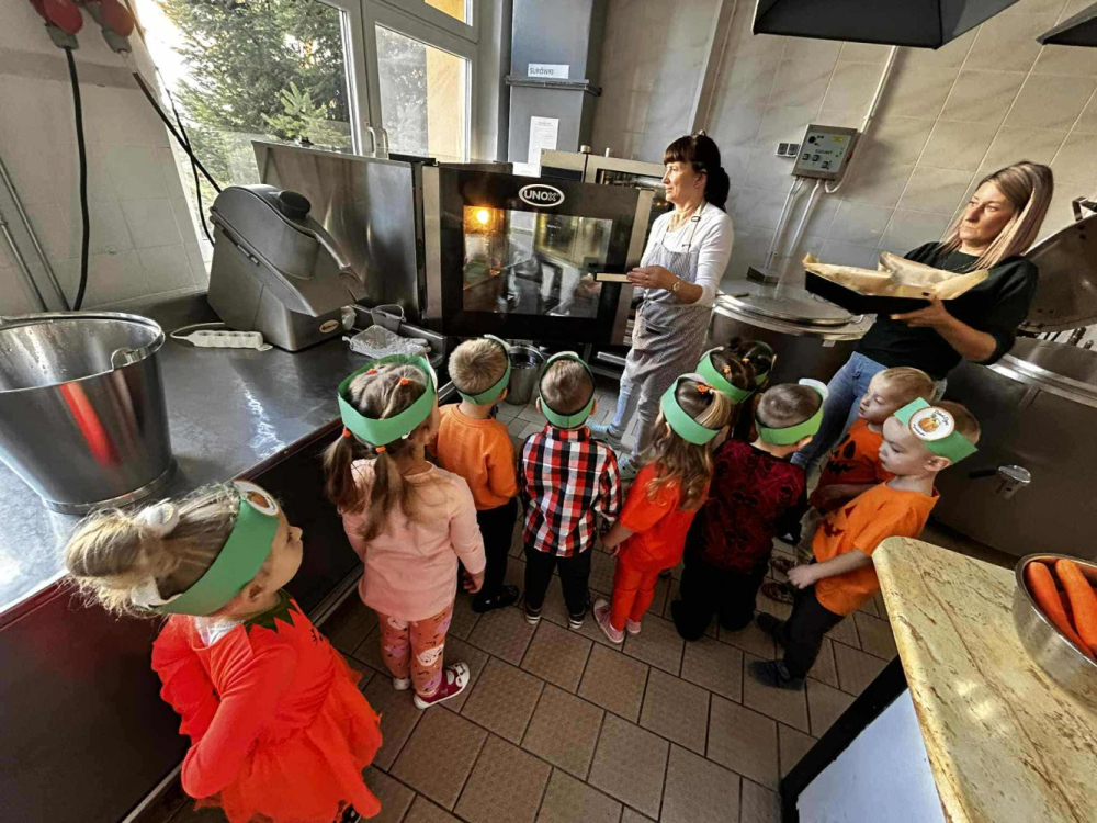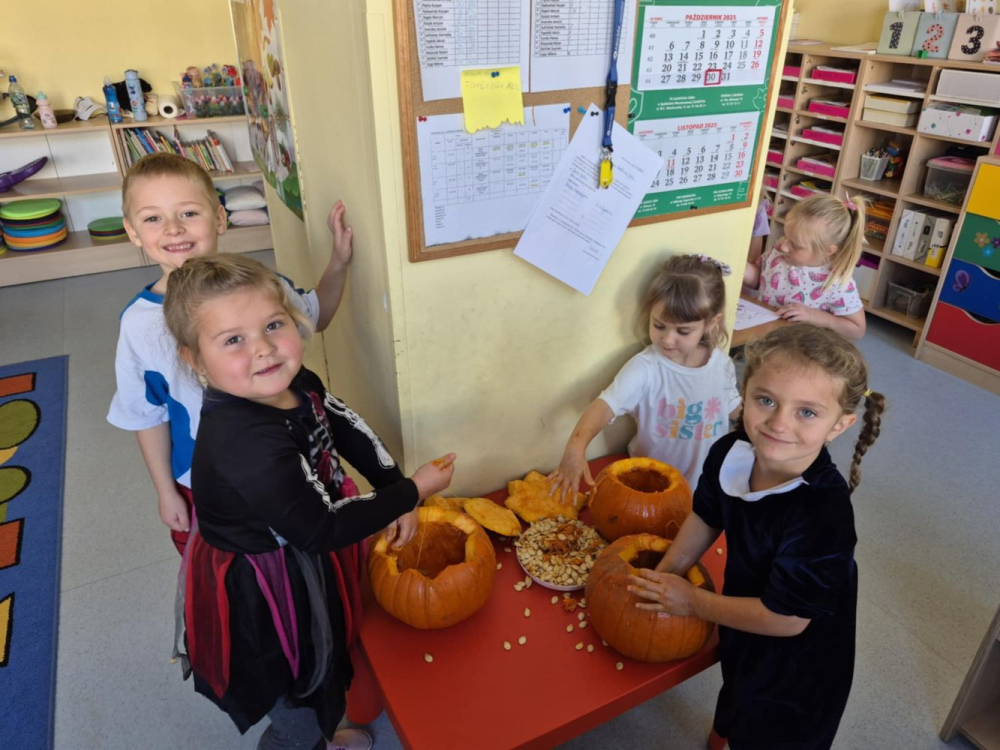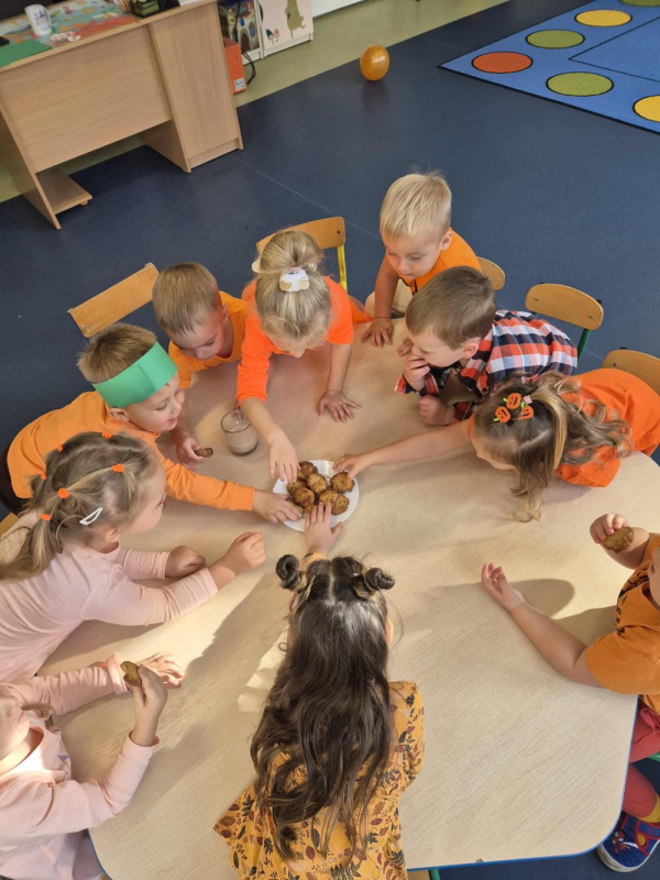 Podczas zajęć przedszkolaki poznały budowę dyni, dowiedziały się, jakie potrawy można z niej przygotować, a także wspólnie piekły pyszne ciasteczka dyniowe, które później z apetytem degustowały.