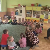 Dzieci dowiedziały się jak powinniśmy zachowywać się podczas pobytu w bibliotece, na czym polega praca bibliotekarza, wysluchaly wiersza Juliana Tuwima pt. "Lokomotywa" a na koniec wspólnie bawiły sie przy piosence o pociągu.