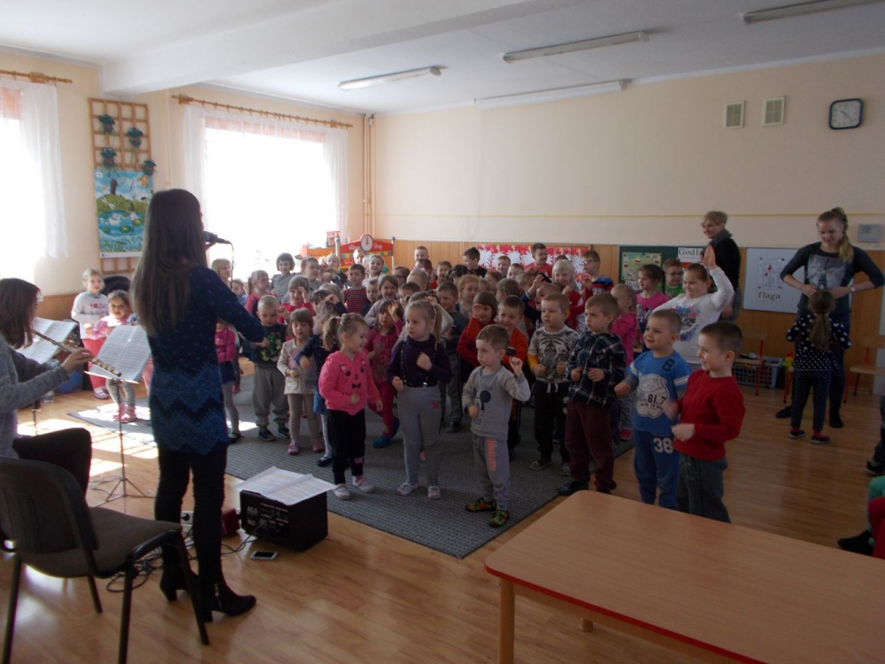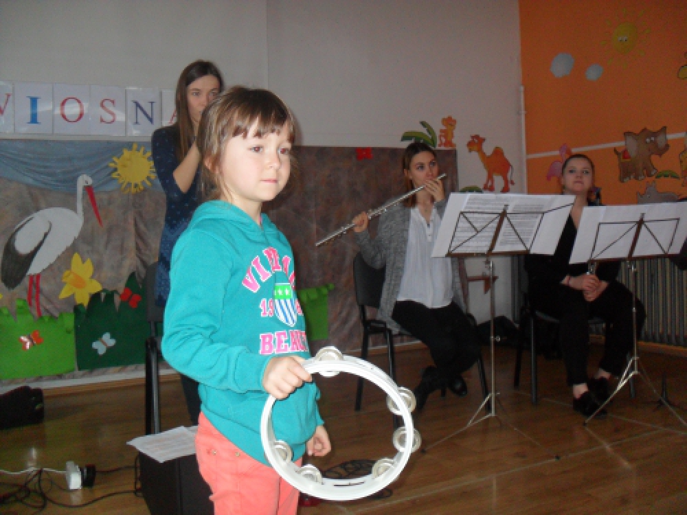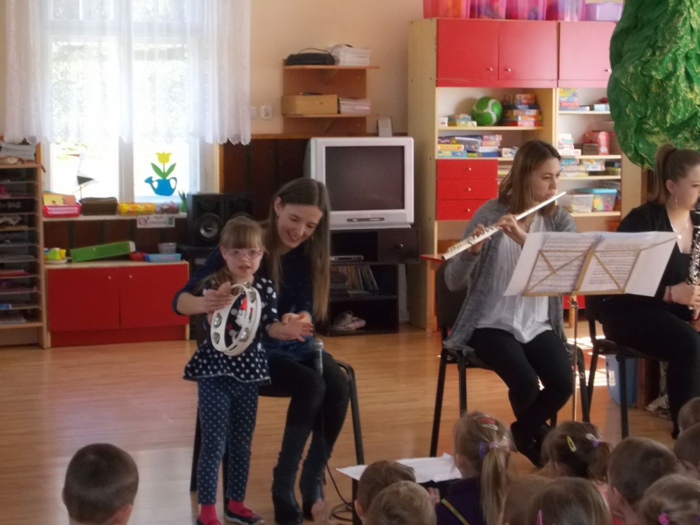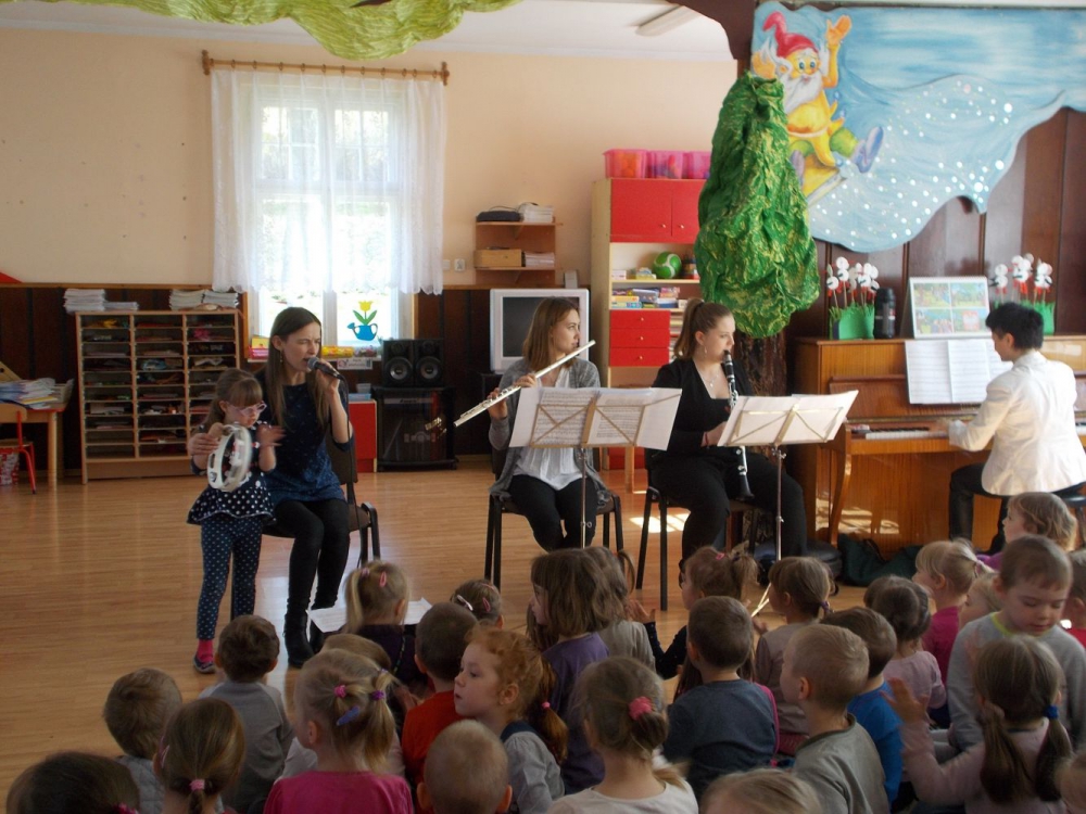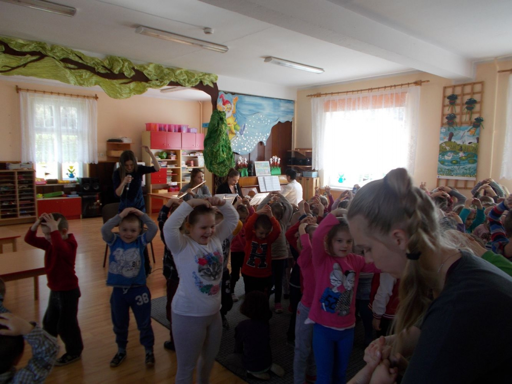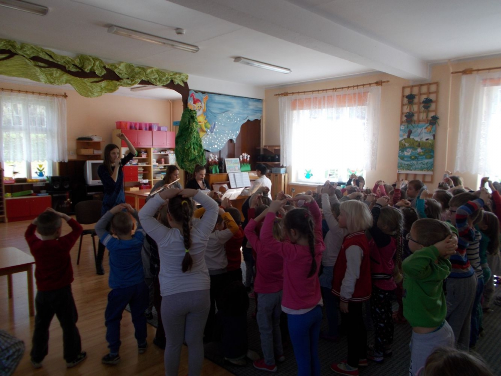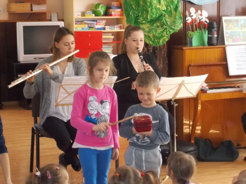 Dzieci z Przedszkola przy ul. Dworcowej i ul. Szymrychowskiej wzięły udział w koncercie pt. "Podwórkowa symfonia" w wykonaniu muzyków z Filharmonii Dolnośląskiej w Jeleniej Górze