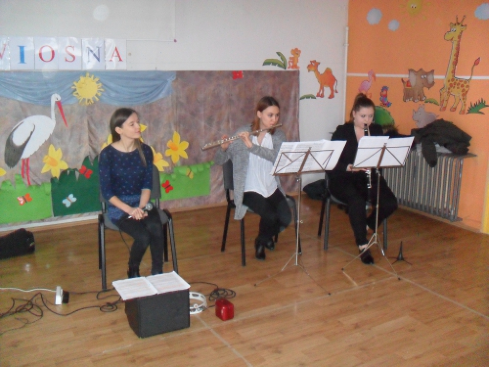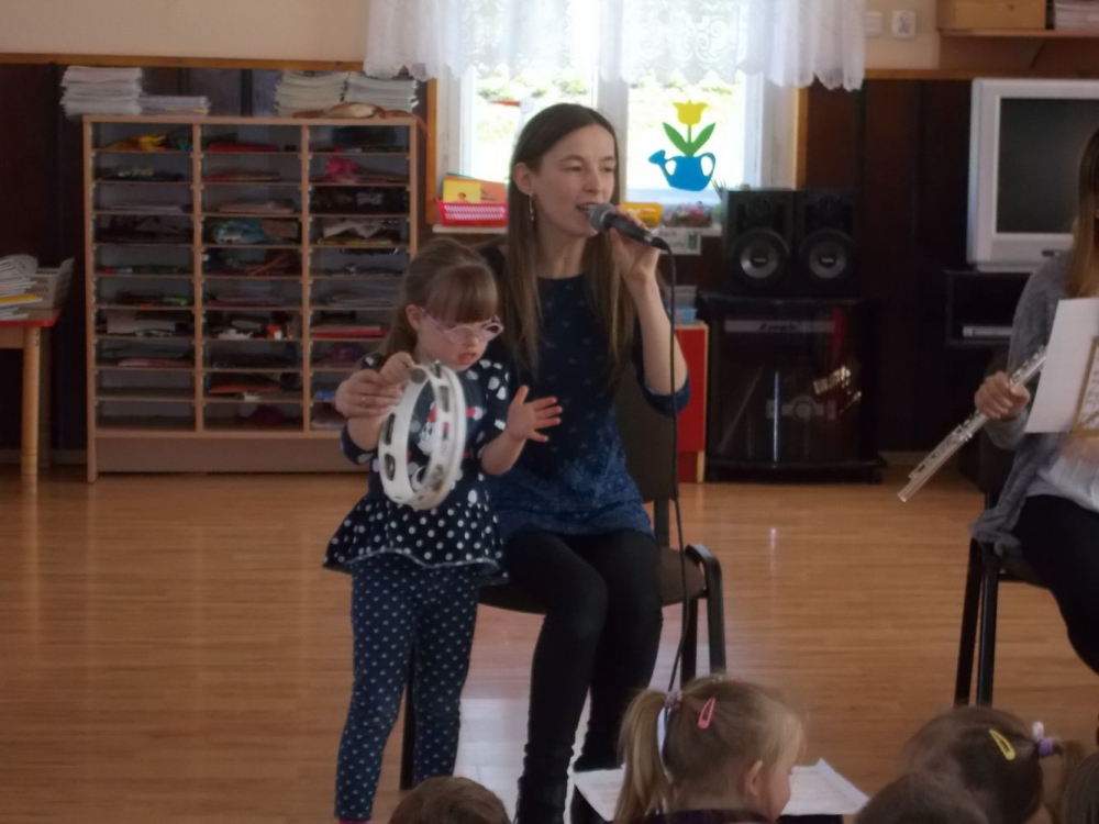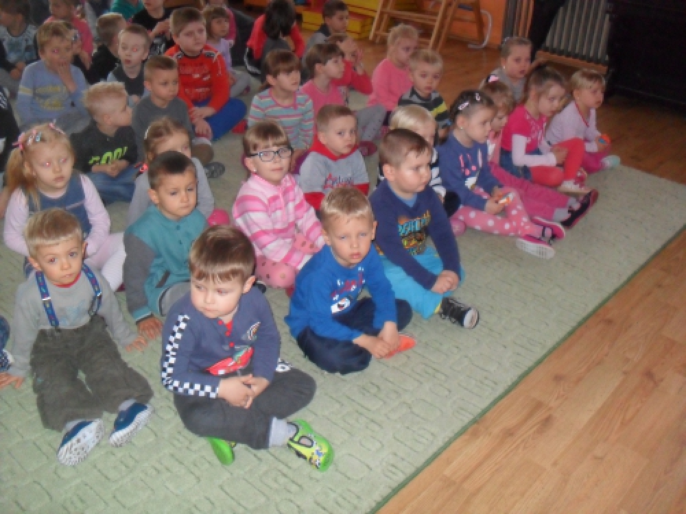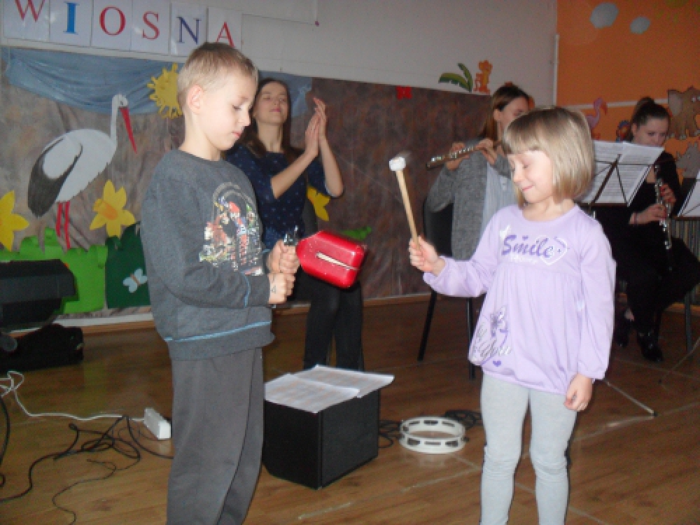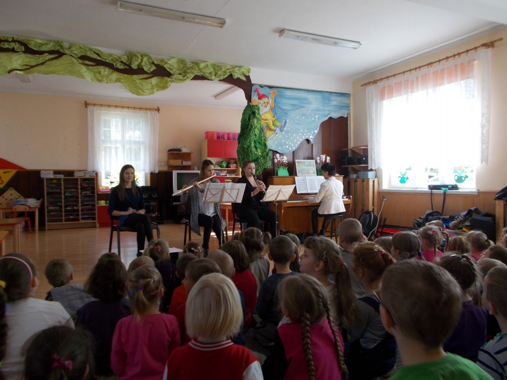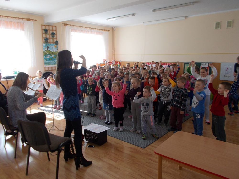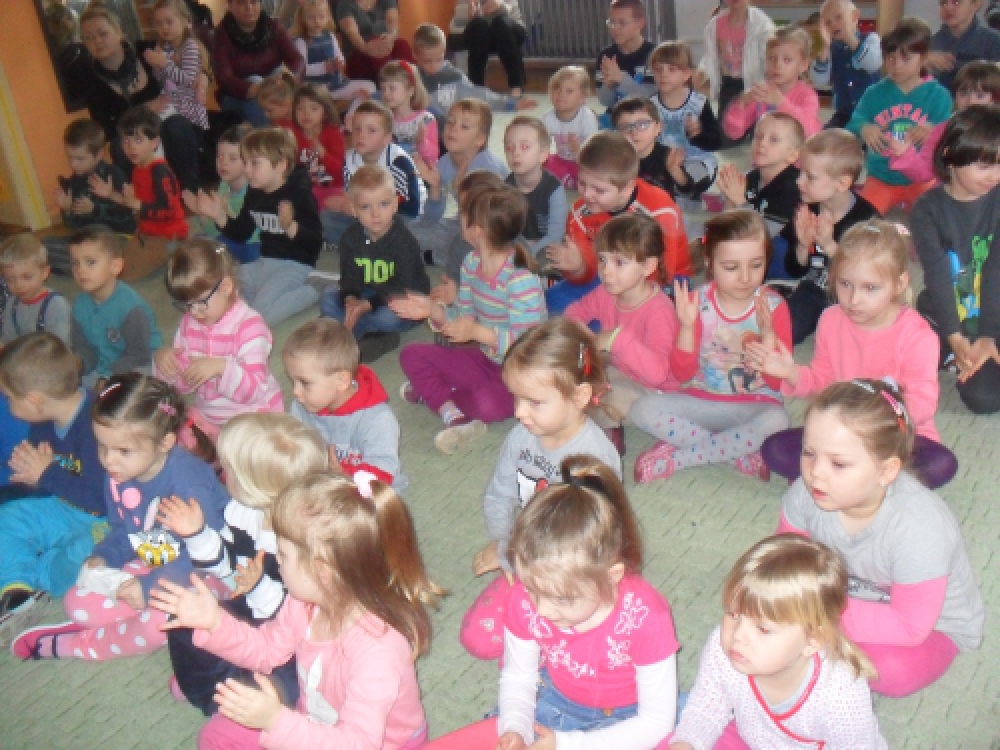 Dzieci z Przedszkola przy ul. Dworcowej i ul. Szymrychowskiej wzięły udział w koncercie pt. "Podwórkowa symfonia" w wykonaniu muzyków z Filharmonii Dolnośląskiej w Jeleniej Górze