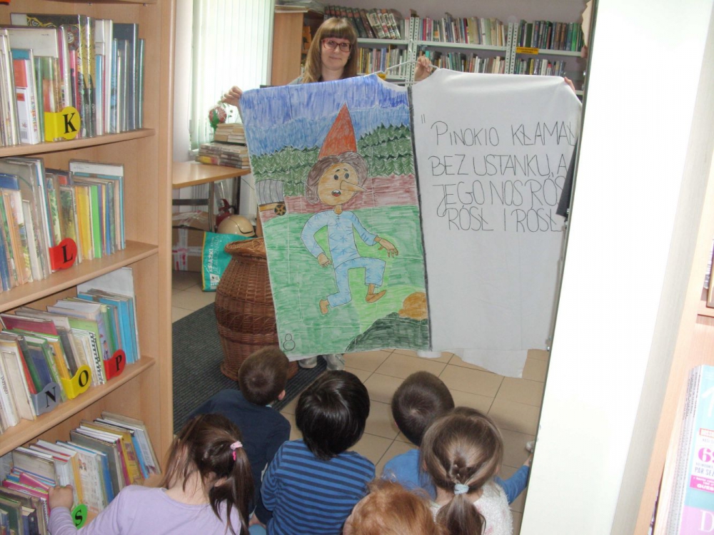 06.05.2016 r. dzieci poznały bibliotekę, pracę bibliotekarza, dowiedziały się co należy zrobić, aby zostać czytelnikiem biblioteki oraz jak należy się w niej zachowywać. Wzięły udział w pogadance o bajkach oraz w "bajkowych zabawach". Przedszkolaki przekazały pani bibliotekarce swoje prace plastyczne pt. "Spotkanie z Czerwonym Kapturkiem" , z których zorganizowana zostanie wystawa.
