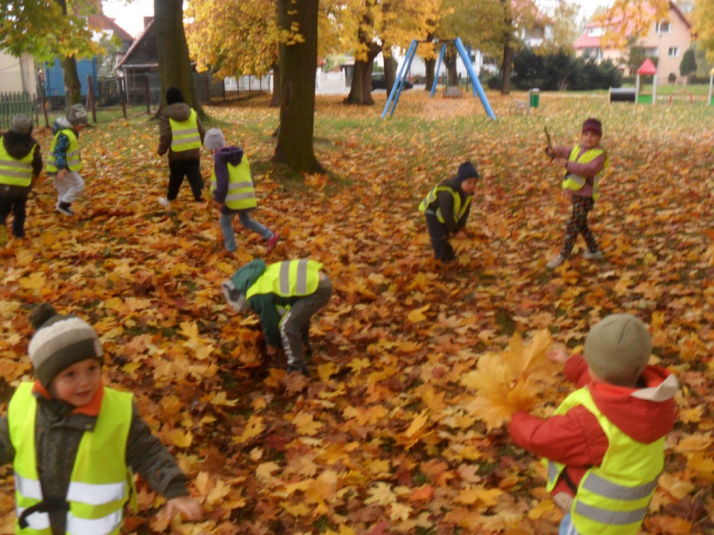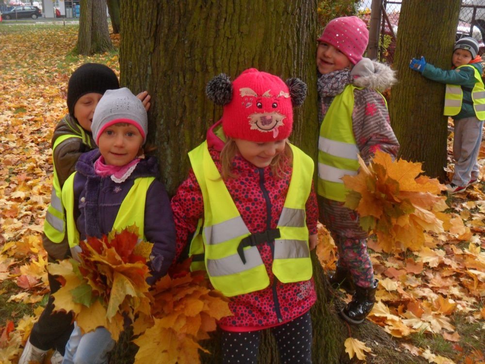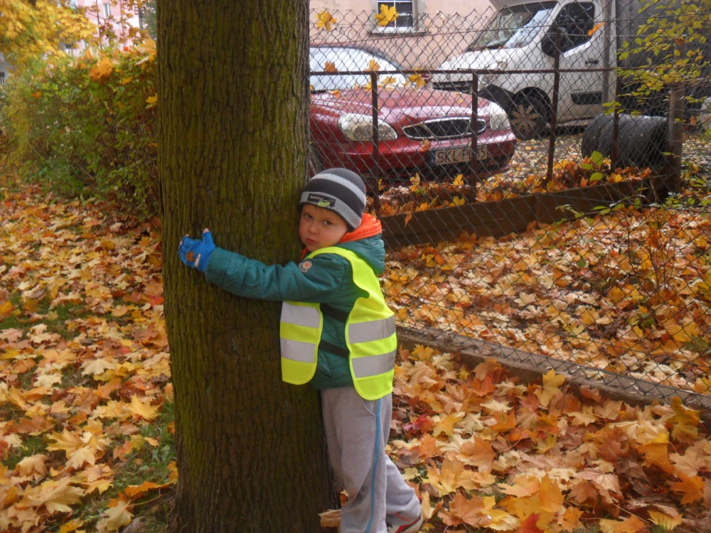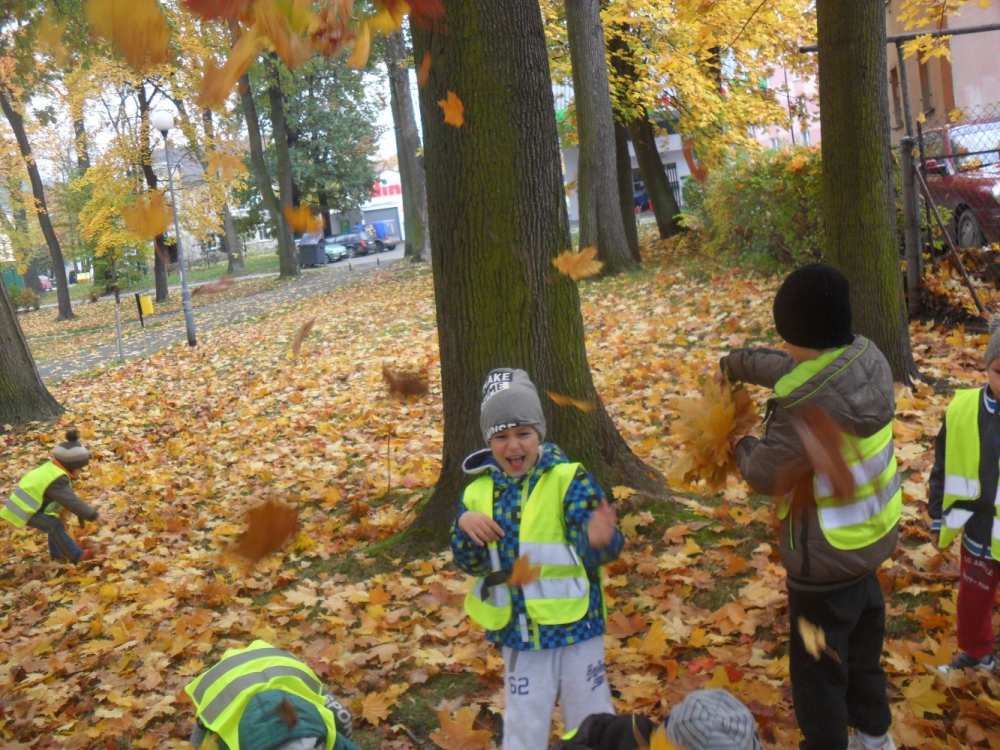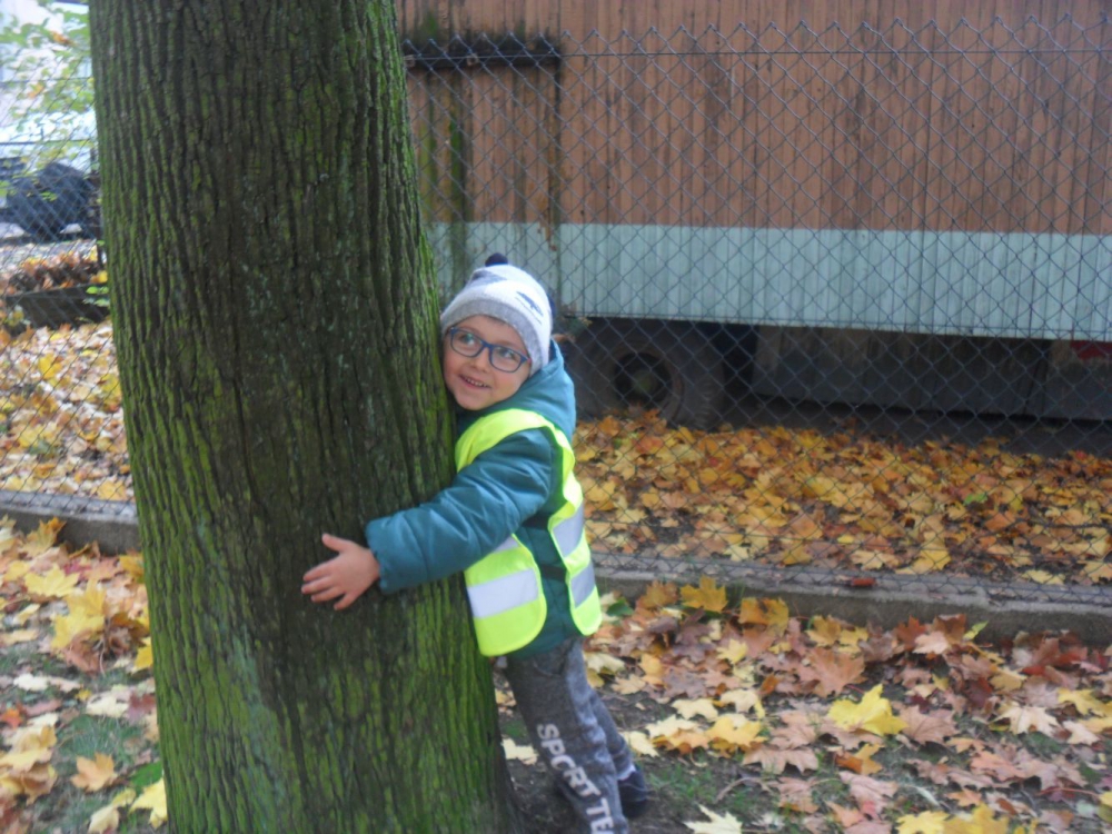Dzieci z grupy Wesołe Bąki i Krasnoludki były na spacerze w parku "Watra". Obserwowały zmiany zachodzące w przyrodzie. Zbierały dary jesieni, rozpoznawały liście po kształtach i określały ich kolory. Dużą radość sprawiała dzieciom zabawa w "spadające liście". Przedszkolaki przytulały się do drzew aby pozyskać siły witalne i energię na pozostałą część dnia. Zrelaksowane i szczęśliwe powróciły do przedszkola.