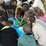 Najważniejszym punktem naszego spotkania była specjalnie przygotowana makieta Ziemi, na której uczniowie dłońmi namalowali oceany i lądy. Było dużo śmiechu i wspólnej zabawy.
