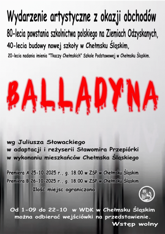W związku z uroczystościami jubileuszowymi 80. rocznicy powstania polskiego szkolnictwa na Ziemiach Odzyskanych, 40. rocznicy budowy nowej szkoły w Chełmsku Śląskim. oraz 20. ? lecia nadania imienia ,,Tkaczy Chełmskich? placówce oświatowej w Chełmsku Śląskim zapraszamy na premierę spektaklu Balladyna w reżyserii i adaptacji Sławomira Przepiórki - wrocławskiego aktora, absolwenta chełmskiej podstawówki. W roli aktorów zobaczymy mieszkańców Chełmska Śląskiego i okolic.