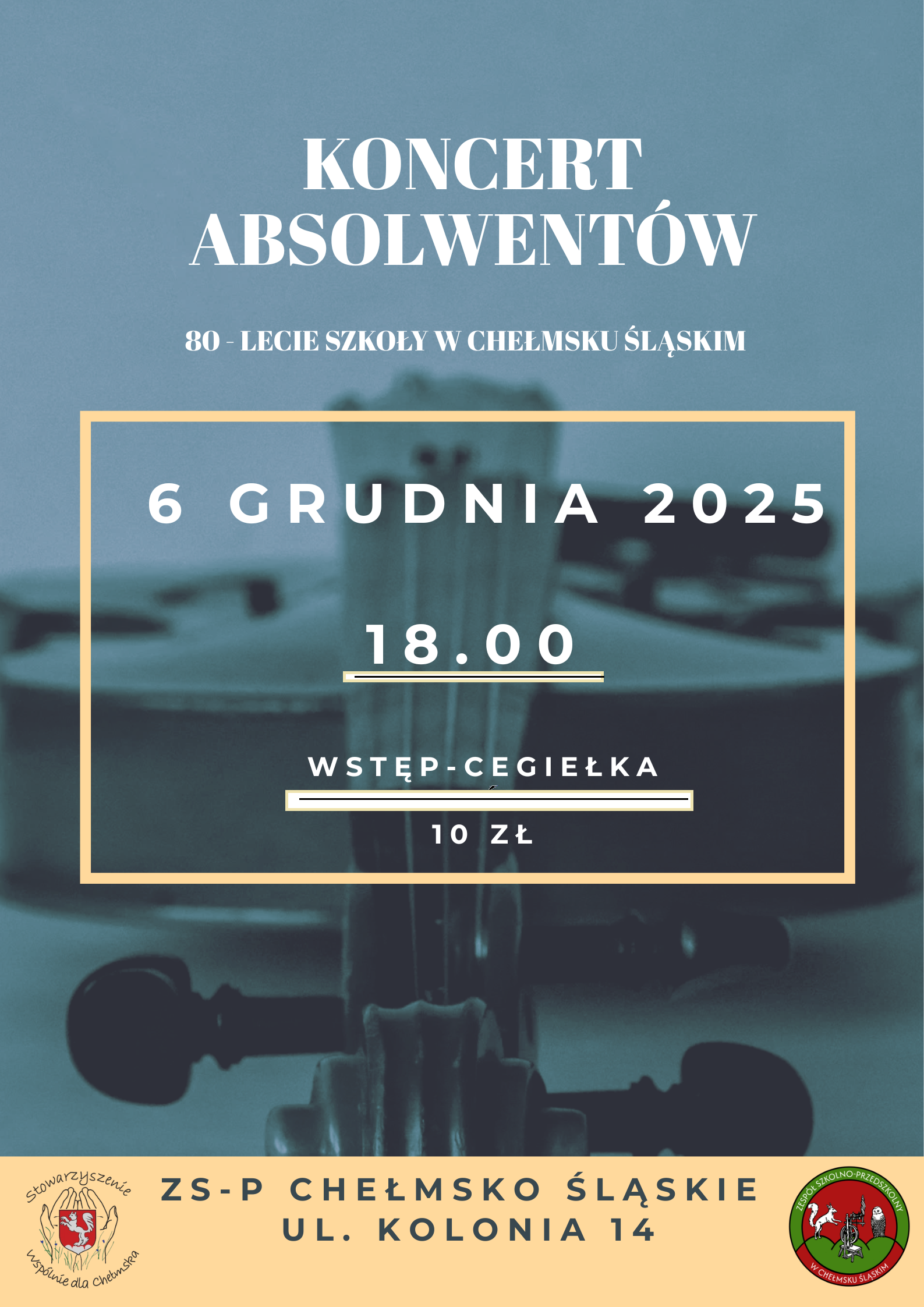 KONCERT ABSOLWENTÓW - CHEŁMSKO ŚLĄSKIE Serdecznie zapraszamy na wyjątkowe wydarzenie artystyczne z okazji 80. - rocznicy powstania szkoły w Chełmsku Śląskim. Koncert Absolwentów. 6 grudnia 2025 r. - sobota., godzina 18.00. Plakat - załącznik Pliki do pobrania Załącznik nr 1 Piotr Górny ZSP Chełmsko Śląskie Data wydarzenia: 2025-11-14 Stworzony: 2025-11-14 09:33 Edytowany: 2025-11-14 12:10