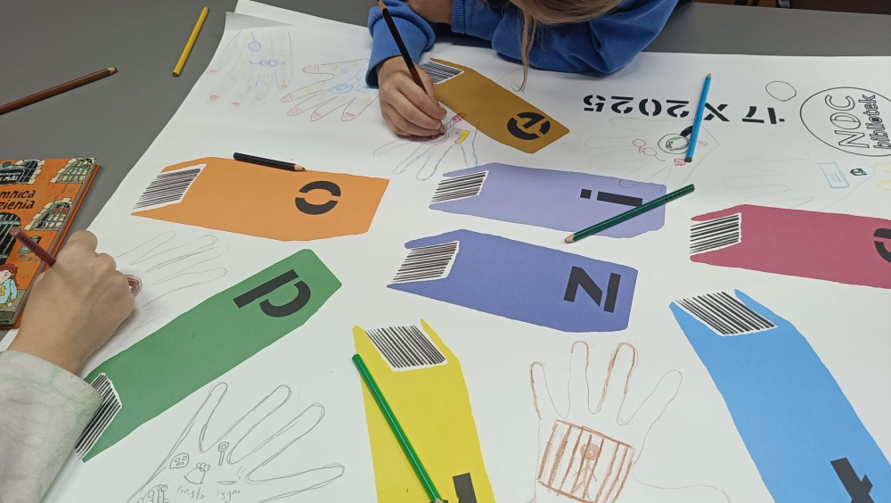 Po obejrzeniu filmu uczniowie wspólnie wykonali plakat, na którym odrysowali swoje dłonie i zostawili odciski palców oraz umieścili miniaturki przedmiotów związanych z pracą detektywów.