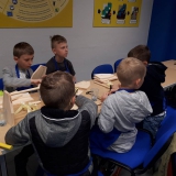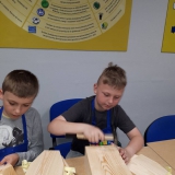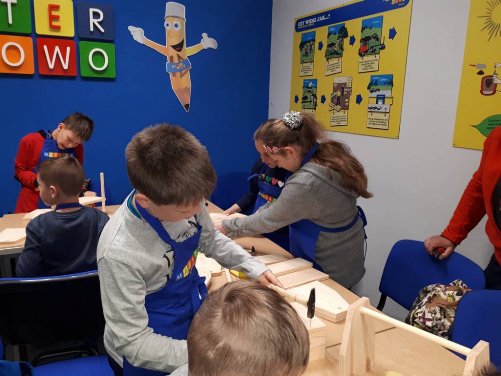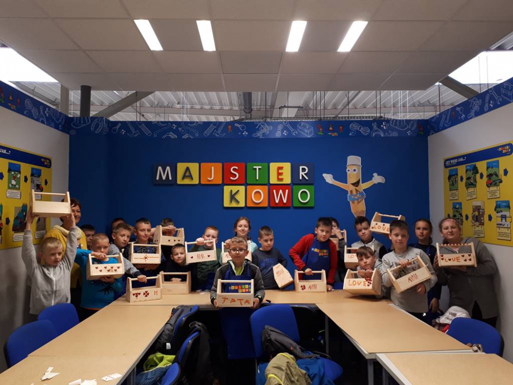 Klasa III a uczestniczyła w zajęciach technicznych w Majsterkowie znajdującym się w Castoramie w Wałbrzychu. W miłej atmosferze uczniowie pod okiem prowadzących zajęcia, samodzielnie wykonywali skrzynki na narzędzia z materiałów drewnianych. Przygotowane wcześniej elementy zbijali za pomocą gwoździ i młotka, następnie dekorowali gotowe skrzynki kolorowymi elementami samoprzylepnymi, ilustrującymi narzędzia pracy oraz serduszka i kółeczka, z których układali różne kwiaty. Tak przygotowane skrzynki otrzymali na własność, które były doskonałym prezentem dla taty wręczanym na uroczystości zorganizowanej z okazji Dnia Matki i Ojca. Zadowoleni uczniowie do domu wrócili z dyplomami wzorowego majsterkowicza. Była to piękna lekcja techniki.