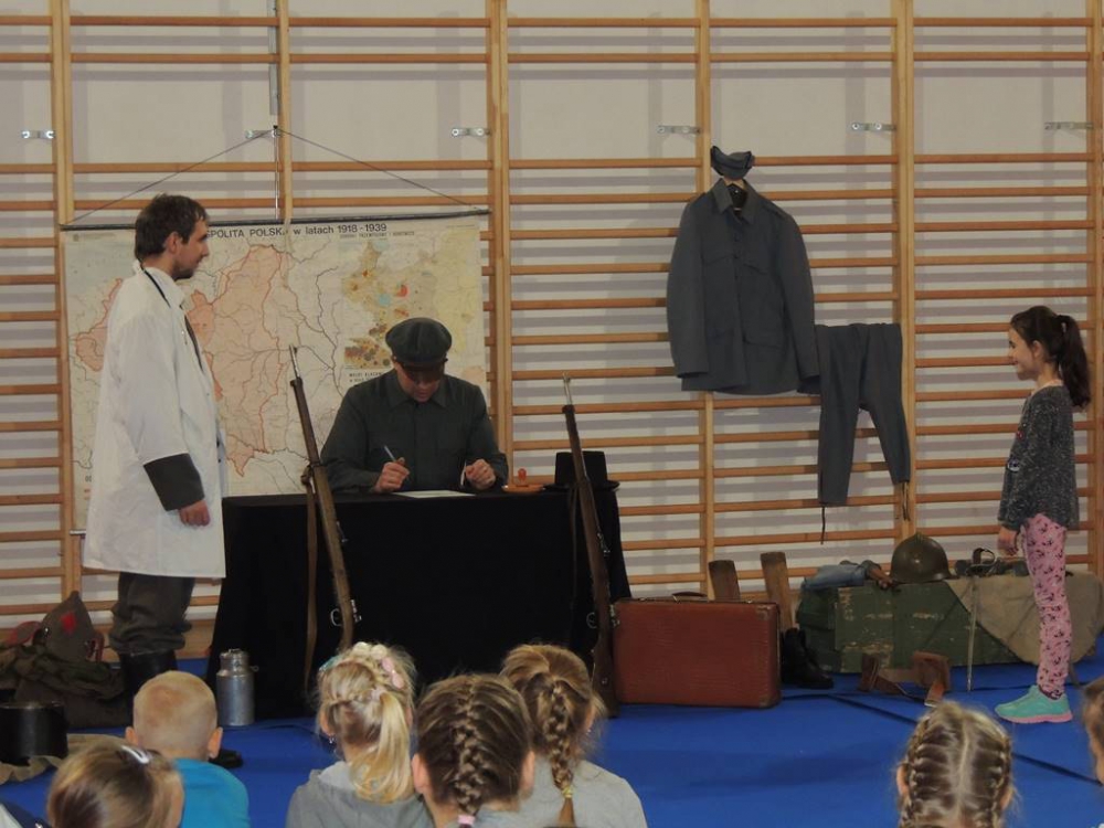 Na niezwykłą żywą lekcję historii w wykonaniu Agencji Widowisk Historycznych Arkona zostali zabrani dziś (14.11.019 r) uczniowie klas I - VIII naszej szkoły. Temat audycji brzmiał: ,,123 lata zaborów - marsz ku niepodległości". Uczniowie mieli okazję zobaczyć umundurowanie żołnierzy polskich, niemieckich i bolszewickich z okresu walki o niepodległość, wcielić się w rolę poborowego Legionistów Piłsudzkiego, wziąć udział w plebiscycie niepodległościowym i zobaczyć walkę na szable. Wszystko to zostało okraszone dużą dawką dowcipu i sprawiło, że każdy uczeń ze spektaklu wychodził nie tylko z dużą dawką wiedzy, ale i z uśmiechem na twarzy.