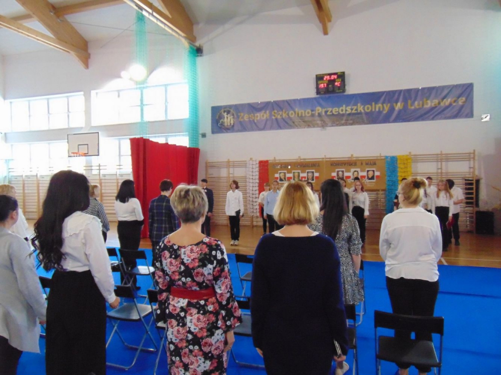 Tegoroczne obchody Konstytucji 3 Maja w naszej szkole miały szczególny charakter ponieważ uroczysta akademia z tej okazji była przygotowana zarówno przez dzieci z klasy 8 b jak i uczniów z Ukrainy uczących się w naszej szkole. Nad całością czuwała pani Edyta Kaczorowska, natomiast za dekorację odpowiedzialna była pani Agnieszka Magiera.