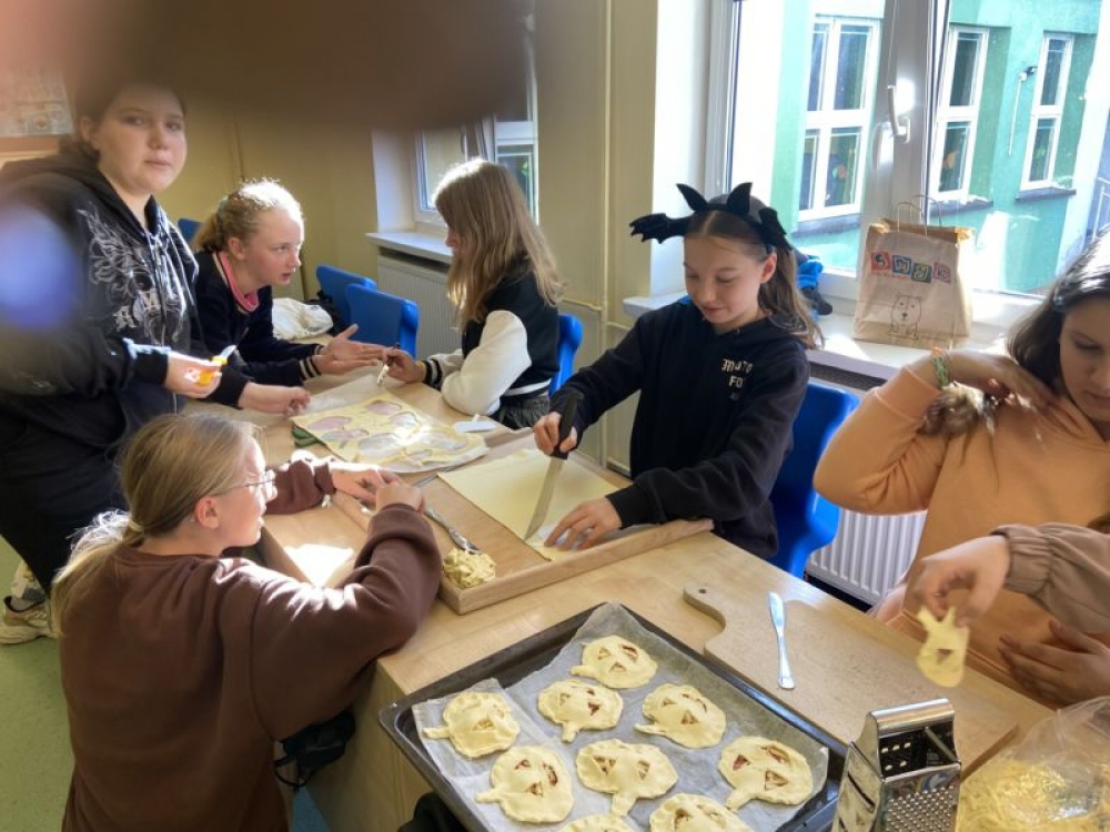 Dnia 30 października klasa 6b zorganizowała skromną ucztę z okazji Halloween na zajęciach języka angielskiego. Uczniowie wraz z panią Anną Majerską mieli okazję spróbować swoich umiejętności kulinarnych robiąc pyszne ciastka - dynie z ciasta francuskiego. Zajęcia zakończyły się wspólnym zdjęciem oraz quizem wiedzy o Halloween. Podczas zajęć tematycznych uczniowie rozwijali nie tylko swoją wrażliwość międzykulturową ale także w przyjemny sposób zdobywali wiedzę na temat jak ludzie celebrują swoje tradycje w innych krajach.
