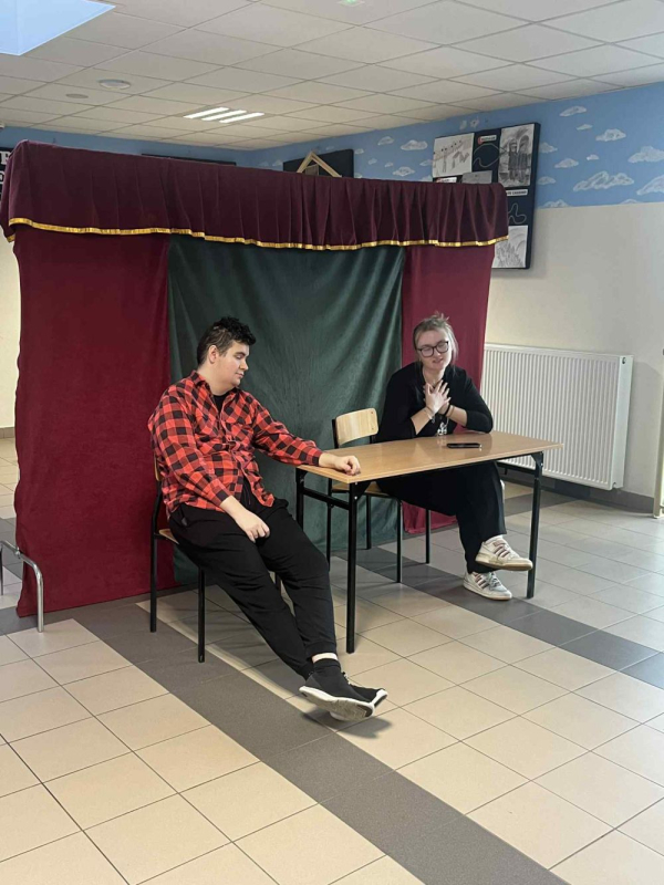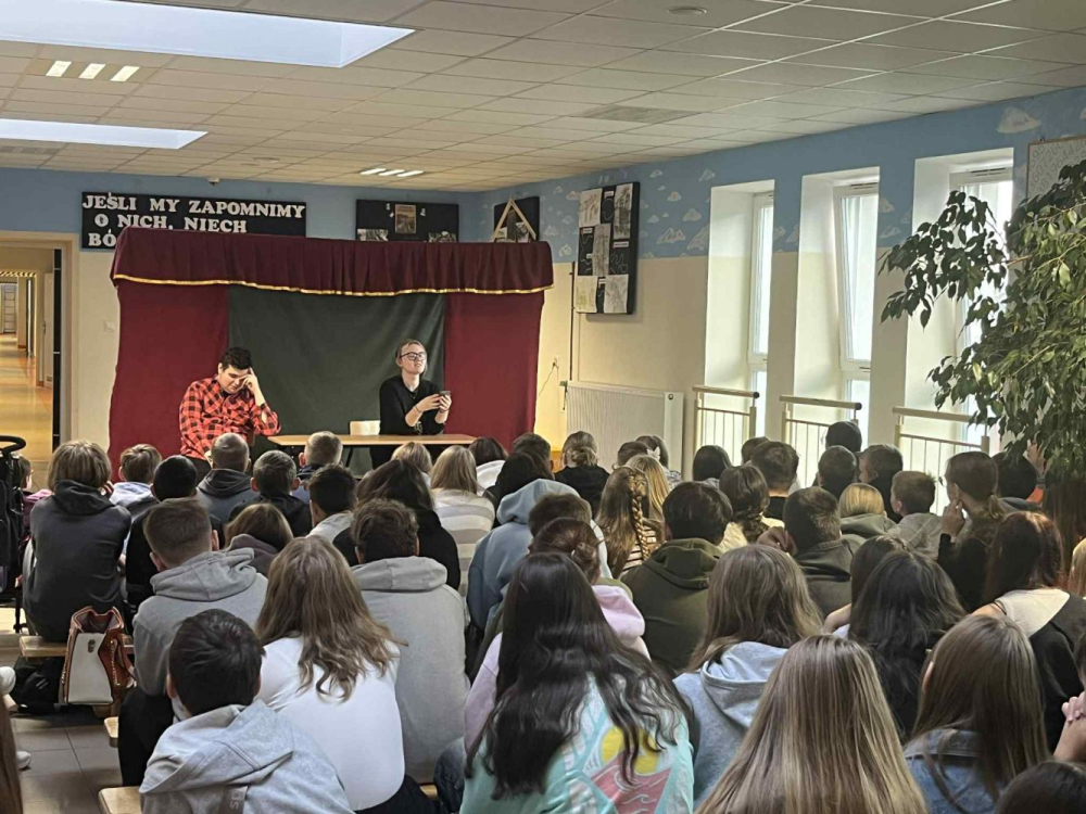 Uczniowie klas VI-VIII wzięli udział w spektaklu profilaktycznym ,,W sieci słów". Dzięki temu mogli pogłębić swoją wiedzę jak bardzo wirtualne gesty potrafią wpływać na realne życie. Jak trudno podnieść się po fali hejtu i jak łatwo przeoczyć, że ktoś obok nas przestaje się uśmiechać. To opowieść o samotności mimo zasięgów, o potrzebie prawdziwego kontaktu i o tym, że czasem jedna wiadomość może coś zmienić na lepsze lub na gorsze.