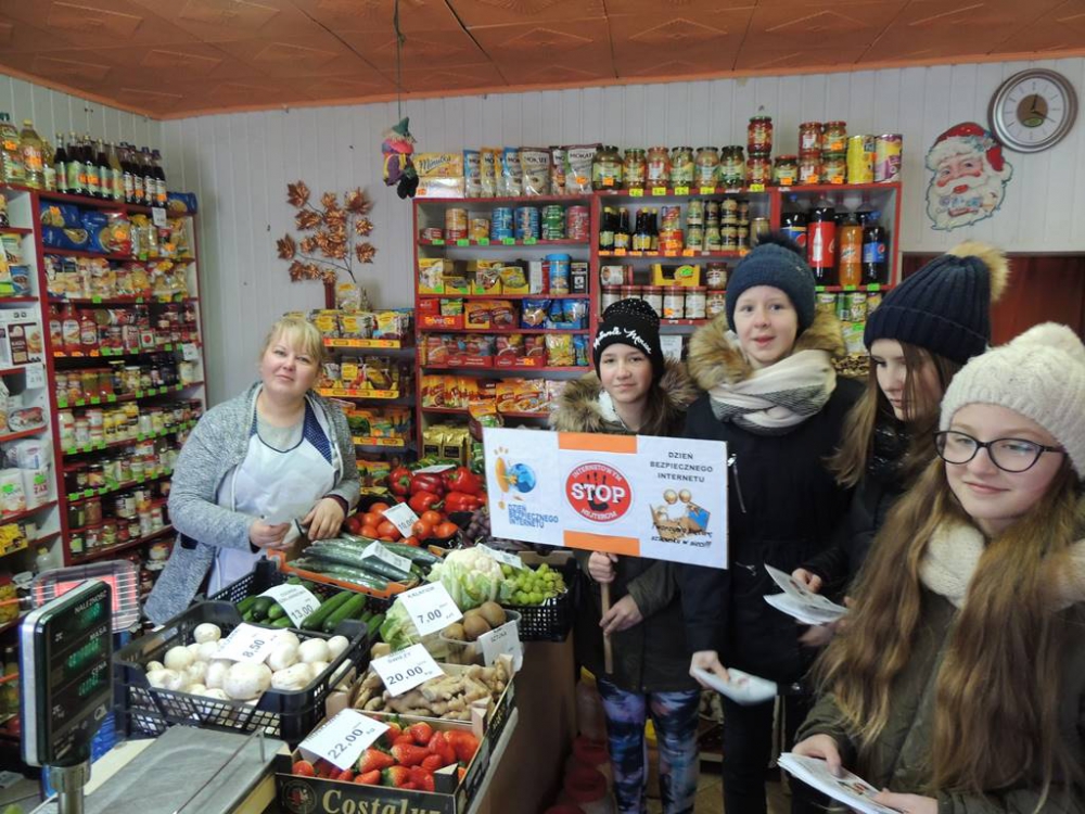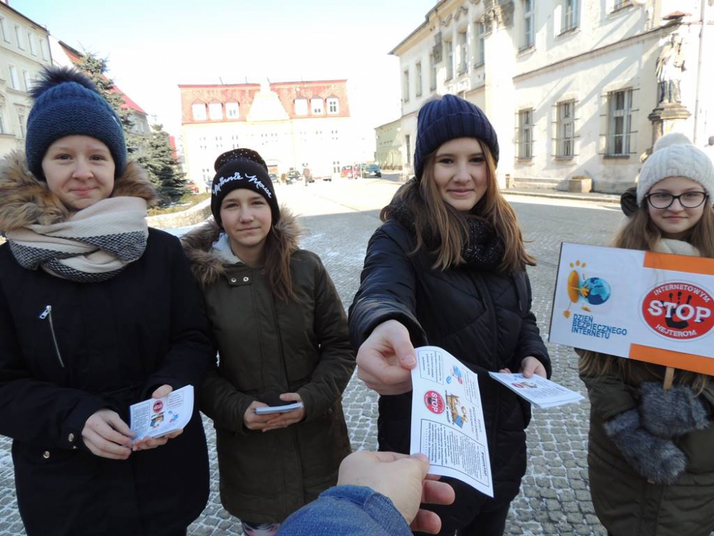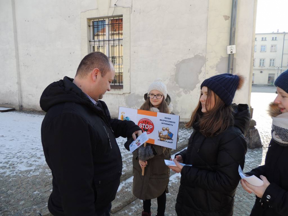 Natomiast uczniowie klas VI wyszli na miasto by napotkanym mieszkańcom podarować ulotki, w których zawarte były dobre rady jak bezpiecznie poruszać się po Internecie. Napotkane osoby również z zainteresowaniem słuchały, co na ten temat ma im do powiedzenia młodzież. Organizatorami obchodów DBI w klasach IV - VI są: pani Eliza Grzelewska i pan pedagog Krzysztof Jawor.
