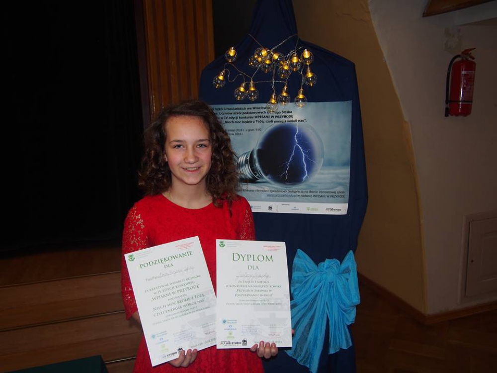 Dziś (21.02.2018 r) uczennica naszej szkoły Justyna Jeżewska z klasy VI a, uczestniczyła wraz z rodzicami w podsumowaniu konkursu na najlepszy komiks ,,Przygody żarówki w poszukiwaniu energii". Uroczystość miała miejsce we Wrocławiu w Zespole Szkół Urszulańskich. Okazało się, że Justynka zdobyła pierwsze miejsce, co jest wielkim sukcesem. Organizacją konkursu na terenie szkoły zajmowała się pani Renata Kozubska - Sopata.