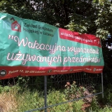 Na wakacyjną wyprzedaż przeznaczyliśmy miejsce w górnej części placu targowego (przy trafostacji), gdzie znajduje się baner informacyjny i pięć stołów - stanowisk, na których sprzedający może wyeksponować swój towar.