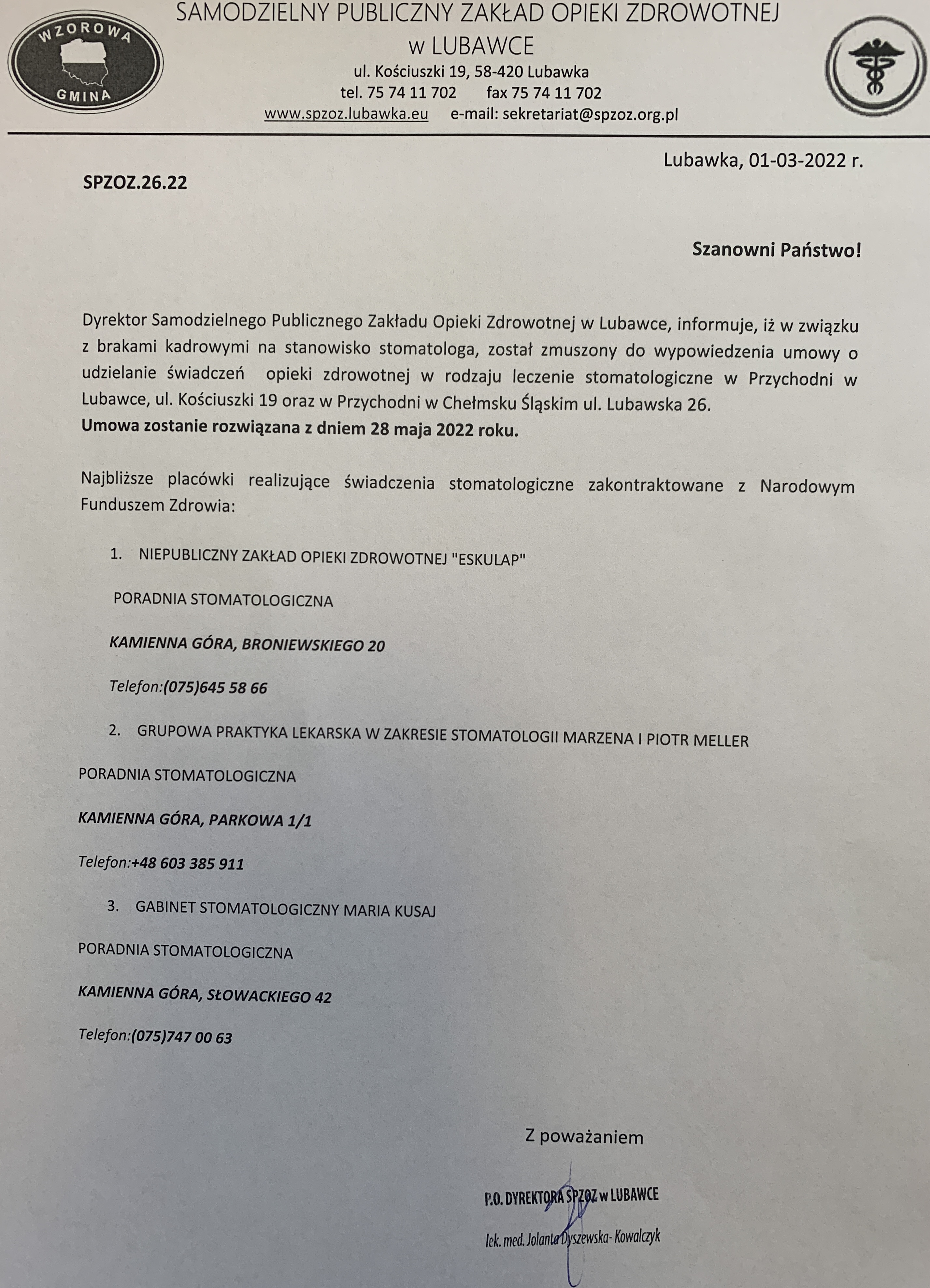 Dyrektor Samodzielnego Publicznego Zakładu Opieki Zdrowotnej w Lubawce, informuje, iż w związku z brakami kadrowymi na stanowisko stomatologa, został zmuszony do wypowiedzenia umowy o udzielanie świadczeń opieki zdrowotnej w rodzaju leczenie stomatologiczne w Przychodni w Lubawce, ul. Kościuszki 19 oraz w Przychodni w Chełmsku Śląskim ul. Lubawska 26.